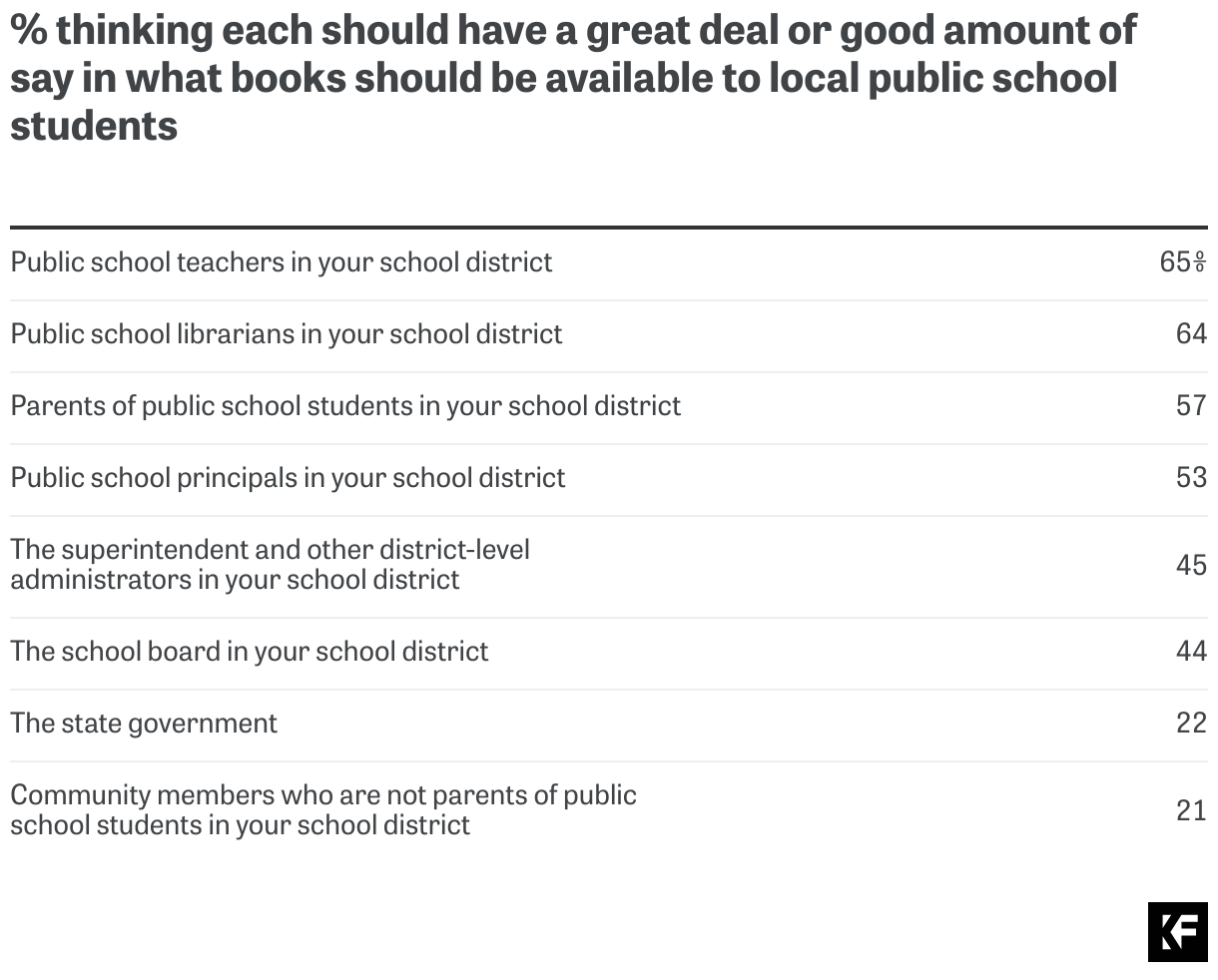 - About two-thirds think public school teachers and librarians should have substantial say in deciding what books are available; 57 percent say the same about pre-K-12 parents. In contrast, just about two in 10 say so about their state government or community members who are not pre-K-12 parents.