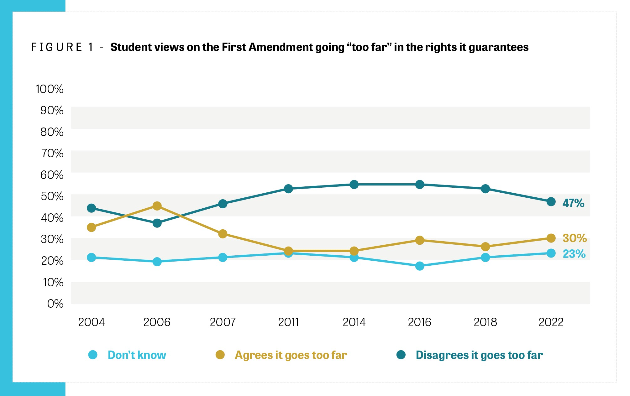 - In every survey we have conducted since 2004, we found that students who have taken classes that include First Amendment content tend to be more supportive of free speech rights than those who have had no such coursework. The 2022 survey once again confirms the connection between First Amendment coursework and support for free speech rights.